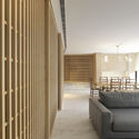 The timber screens allow for a visual interference while permitting light to pass through in a veil like quality of hazy diffuse daylight and noise reduced ambience. Laminated glass, positioned between the timber verticals break down space both acoustically and climatically, articulating one space from the other in quietude with distinct states of comfort. The vertical screen pattern likewise mitigates sound reverberation in the public areas of the home creating a hushed atmosphere even with high levels of noise with children at play.