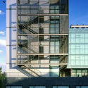 The energy-efficient system is completed with a ventilated double cover formed by metal louvers that meet three functions: the protection of the air conditioning machinery, the solar light passive control optimizing the circulation of air, and the support of the photovoltaic panels.