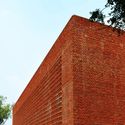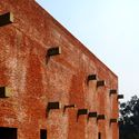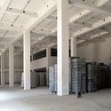 Rather than overlay a conventional window-based punctured façade over the structural frame, the warehouse and loading bay are wrapped in a perforated brickwork screen.This screen shades a glazed dust barrier, recessed by 1200mm from the south and north facades, creating a buffer zone that cuts glare, serves as a utility zone and provides a high degree of passive insulation. The glazed barrier can be opened during good weather for ventilation and during extreme weather to allow for mechanical ventilation. The west facade is mostly blank with only a sliver of brick screen near the ceiling to permit evening illumination and the completely blank east façade faces the loading bay. The exposed brick unifies the various facades and minimizes the visual impact of the building on the surroundings.