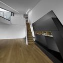 The middle floor is accessible at the same elevation as the road on the north side. On this level there is a garage for two cars, an entrance hall, main staircase, restroom, two kitchens (open and closed/caterer's), a dining area and a living room. Along the south façade, especially in front of the kitchen, there is a big terrace which is cantilevered above the garden. This is also partly covered by the construction of the top floor. This is used mostly as a dining terrace and is accessible through the sliding windows from the kitchen. The living room is covered by a sloping roof which allows the direct vertical connection through the master staircase with the gallery and master bedroom on the top floor. The sloping roof brings the feeling of continual super elevated space. This idea is also supported by placing a triangular window on the facade heading to the private master terrace in front of the master bedroom and the gallery. This window brings light to the interior, even if the main windows on the south are covered. The triangular window also allows the visual connection between the private master terrace and the living room or gallery. The master staircase railing brings a dynamic shape into the interior as does the other furniture like the kitchen made of white tri-stone and the black painted oak book case. To the east, behind the master staircase there is a sloped window with a nice view to the Zen garden with a proposed stone statue, which would be illuminated from below. Next to the window, there is a built in couch, where you can have a nap with a book while looking at the statue.