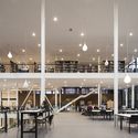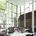 The new entrance hall, with its large glazed facade, has a strong visual connection to the neighbourhood, making the school a part of the community. The entrance hall offers views of the three-storey central atrium which connects two building wings, creating circulation routes in place of previously dead-end passageways. An auditorium and restaurant are located on the ground floor of the atrium. Freely cantilevered above are the library and study areas.