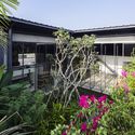 The landscape concept that we mostly desire for approach should provide as much as possible the tropical scenario for the factory. By that meaning, many kinds of tropical plants and fruit plants were installed such as Papayas, Bananas, Tamarinds, Malpighi glabras, Coconut trees, and especially dragon fruit ones which could be considered as one of our first-time attempt. We were inspired by the image of a field with countless rows of poles covered by dragon fruits triangular stems, which would be considered as common sceneries in the middle Vietnam. The in-order pole system made by old bricks intentionally becomes the important landscape element, and tightly connects with the architecture itself.