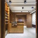 Interior space designed with simple and gentle atmosphere. In this micro architecture, approximately 25 square metres, natural light create charming atmosphere. The feature wall creates lighting effect, by reflection pattern from the outside. Simple local has used as main interior materials. Plywood counter with the same pattern as feature wall create strong identity of retail design. Brick wall divides public and private space of the tailor shop. Back of the wall is the space for tailor discussion and fitting room.