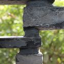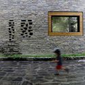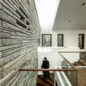B. The stones used on the façade are in harmony with the existing stones in the garden. These stones are used in their natural form but in a controlled horizontal pattern. The voids in the stone pattern provide a controlled overlook and a limited sunlight penetration to spaces such as washrooms and corridors which require less exterior exposure. Integration of the voids and solids not only creates a consistent exterior façade, but also provides the interior spaces with a view to the greenery. At nights these voids provide a lighter feeling of the solid exterior façade. These voids are also used to naturally ventilate the building as well as to implement the mechanical equipment.