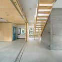 The first floor and second floor are each treated as single rooms, with boxes holding bath and toilet working as rough dividers in the open plan. The height of the second floor was set so the family could see out to the river valley from their living room, looking over the roofs of their neighbors in the hilly site. Taking advantage of the 3 meter high ceilings on the first floor, a large long-term storage is hung from the ceiling, freeing up floor space for daily life. The storage defines the master bedroom and is incidentally used to hang a group of large doors that can close off the bath and the bedroom as needed.