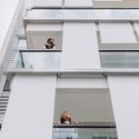 The building consists of 12 apartments, three units per floor; all of them are composed by three bedrooms and different plan layouts. The areas vary from 95m2 to 120m2, and each apartment features a 15m2 frontal balcony.