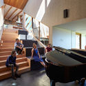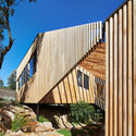 Within this context the Split House provides a range of spatial relationships to its site and the broader territory that carefully balances the owners' desire for privacy and engagement with their surrounds. The house comprises 2 relatively simple volumes linked by a splayed stair that also acts as a seating area for people to gather, listen to music, sit in the sun. Occupying separate levels that follow the natural contours of the site, the 2 pavilions provide a separation between the upper, main living/master bedroom zone and rumpus room/guest bedrooms below. Through the curation of windows and doors a range of direct and indirect connections to the landscape provide multiple opportunities for occupation throughout the year. Smaller elements, such as integrated seating, stairs and study nooks provide spaces for quiet contemplation, juxtaposed with larger communal areas for family and friends to come together.