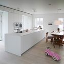 The choice of both shape and material of the extension simultaneously create an affinity and a contrast. The height restrictions from the planning authorities resulted in a split-level floor plan to provide natural light to all rooms in the extension. This solution made the vertical division between floors less prominent and movement through the house effortless. The visual contact between floors, as well as between the building and the landscape outside, enhances the feeling of openness in the house.